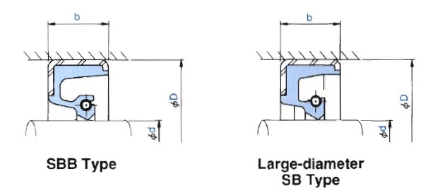 SBB型和大直徑SB型骨架油封用于油、水且無(wú)塵場(chǎng)合的較大直徑(軸直徑大于300MM)的密封。