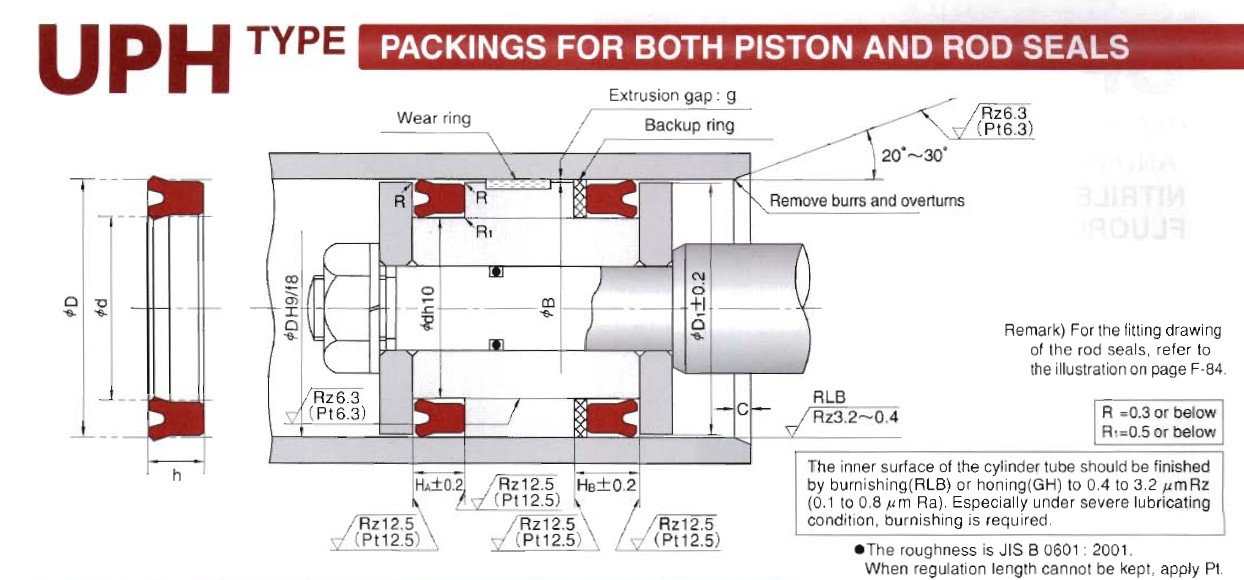 UPH型孔軸兩用密封材料包括邵爾90度丁氰橡膠NBR和邵爾90度氟橡膠FKM兩種,壓力可達(dá)到32MPA,邵爾90度丁氰橡膠材料適用溫度:-25度---+100度,氟橡膠材料適用于溫度:-10度---+150度,UPH型孔軸兩用密封具有較大的截面,可用于大范圍的操作。